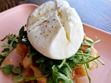 Classic Liege topped with organic arugula, creamy burrata cheese, seasoned with extra virgin olive oil, salt, pepper, and lemon juice.