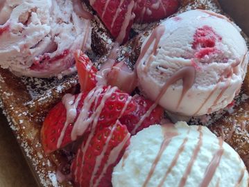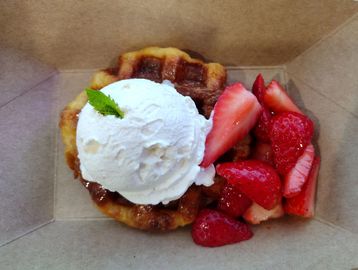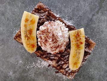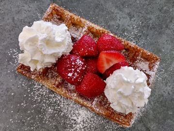 Classic Liege waffle topped with sliced banana, fresh strawberries, our house whipped cream, and Belgian dark chocolate.