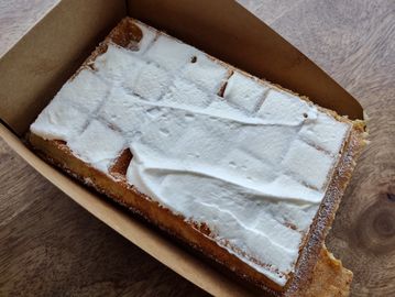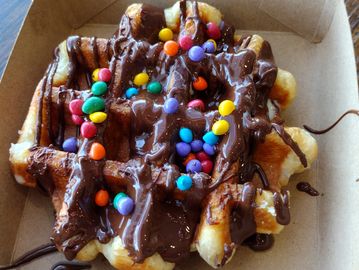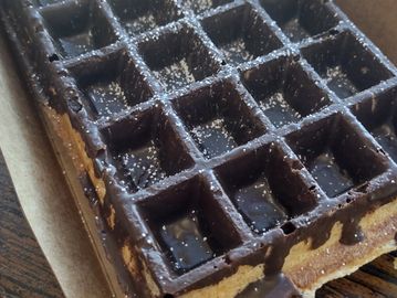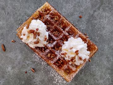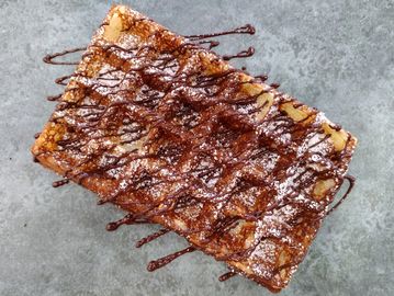 Classic Liege waffle topped with our house whipped cream and Belgian dark chocolate.