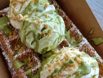 Classic Liege topped with matcha ice cream, sweet Japanese azuki beans, with an optional sprinkle of toasted soy bean powder.