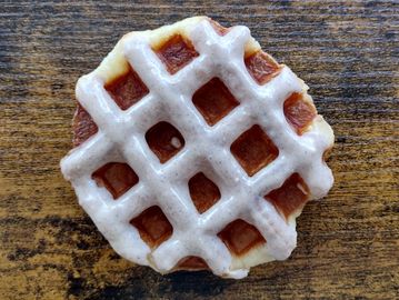 Classic Liege dipped in white chocolate glaze mixed with cinnamon.