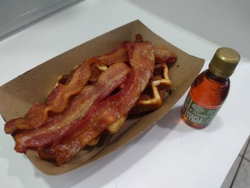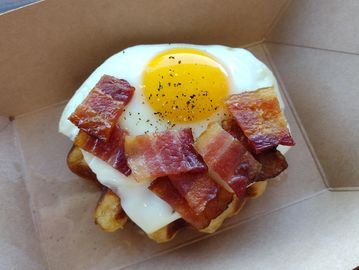Two classic Liege waffles topped with three slices of thick-cut bacon. Served with a bottle of pure Vermont maple syrup.