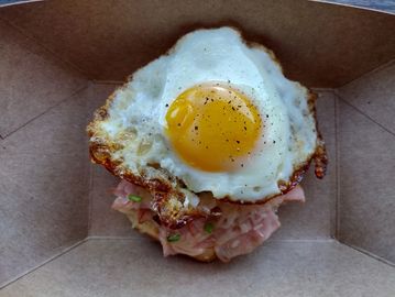 Classic Liege with Bechamel sauce, thinly sliced ham, melted Gruyere cheese, a sprinkle of fresh organic chives, all topped with a sunny-side egg.