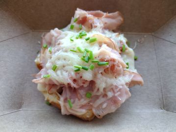 Classic Liege topped with Bechamel sauce, thinly sliced ham, melted Gruyere cheese, and a sprinkle of fresh organic chives.
